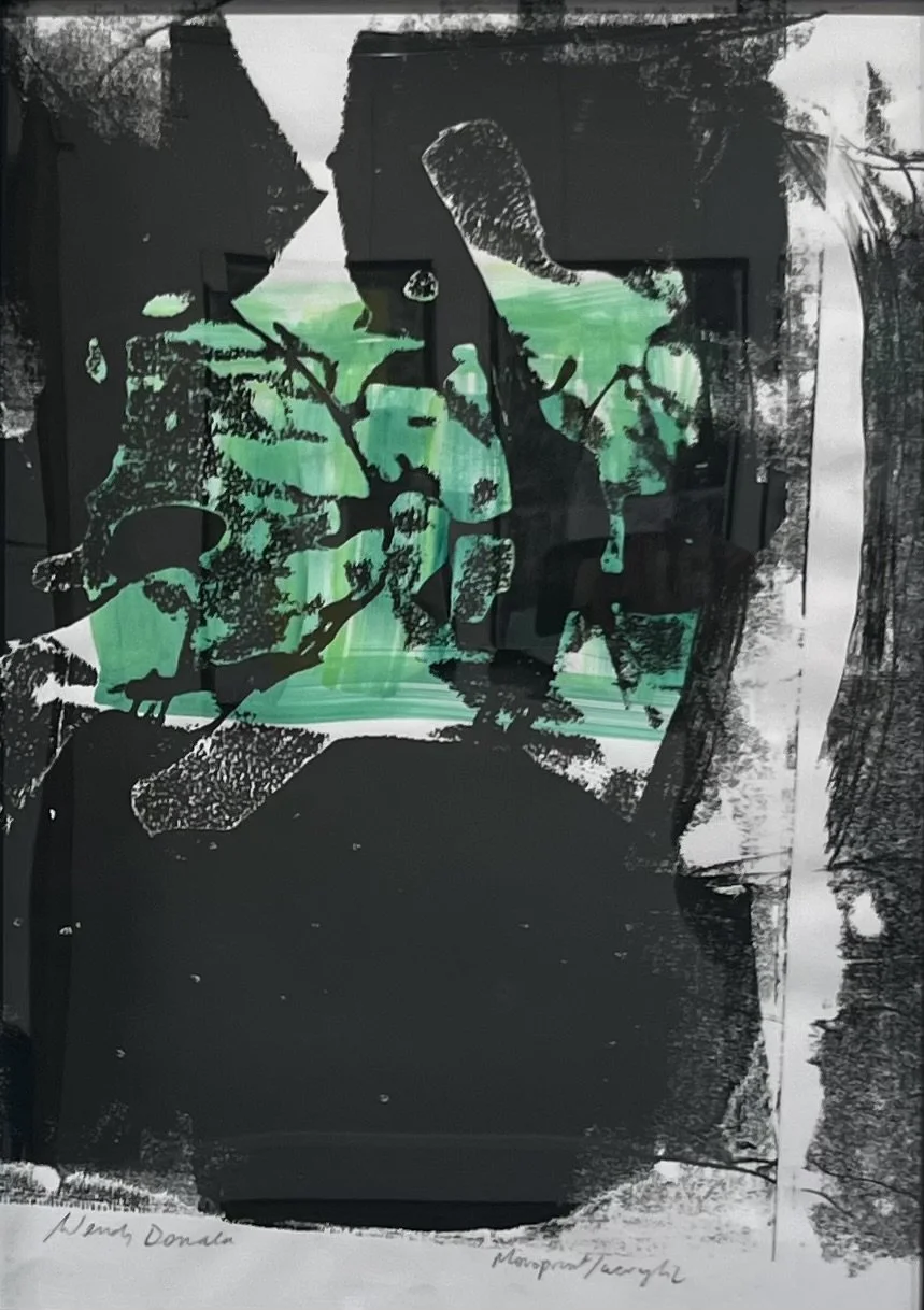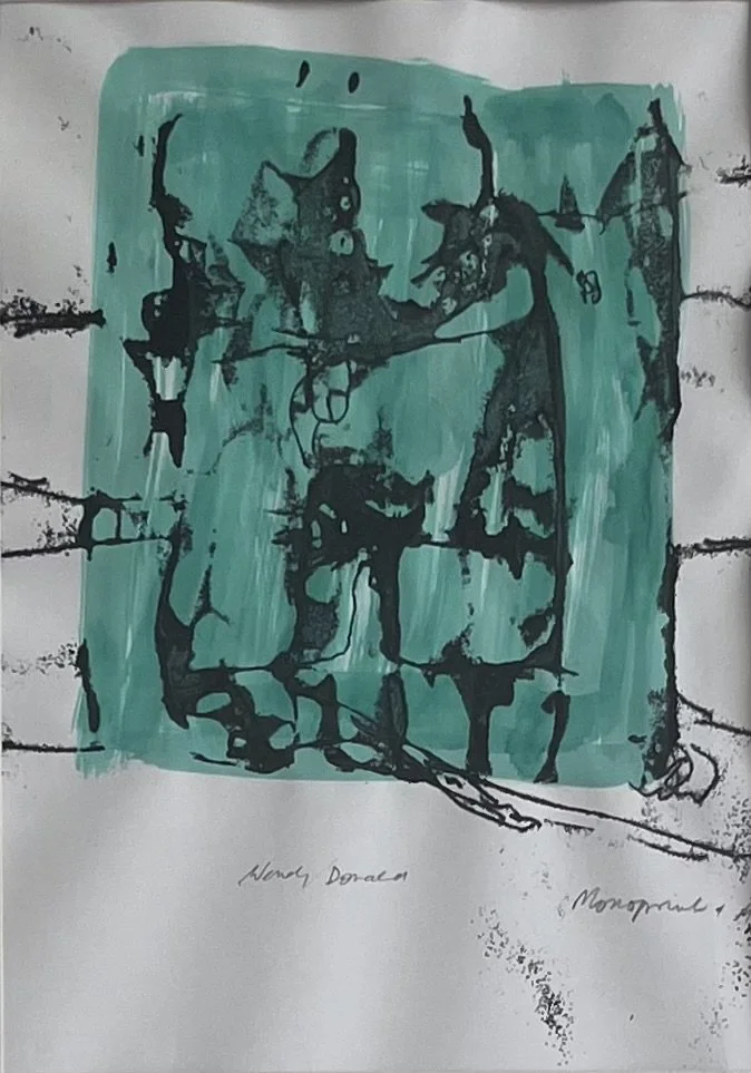 Extrovert, vibrant with accents of colour, these monoprints with overlays stand as a testament to the joy of life. A Touch of Viridian and Ladies in Frocks make a real change from previous introspective series and set out to explore what happens when you dress the human form.